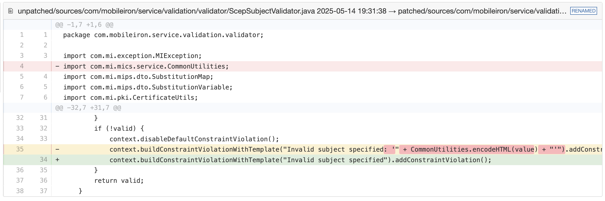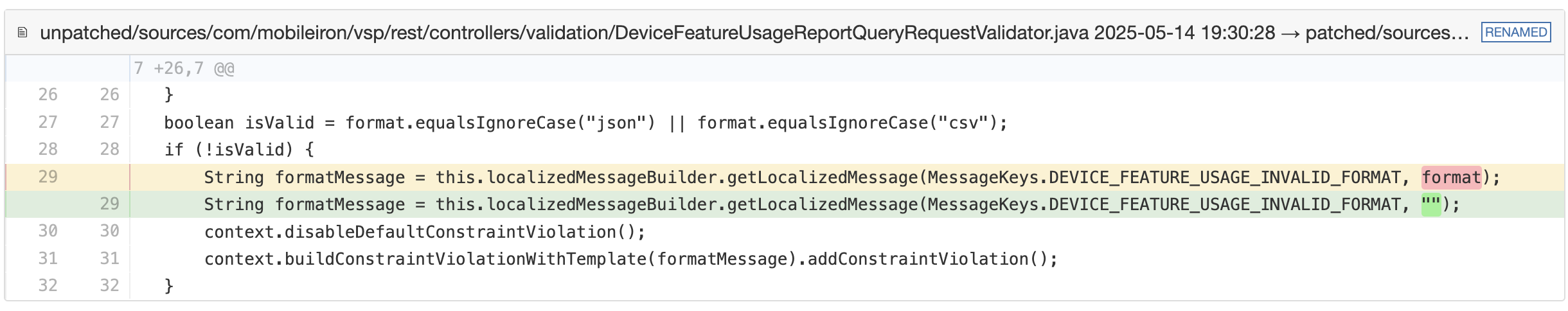 We unpacked both the patched and unpatched builds of the EPMM server and ran a recursive diff across de-compiled classes. Two validators revealed one-line patches that neutralise user input within error messages: