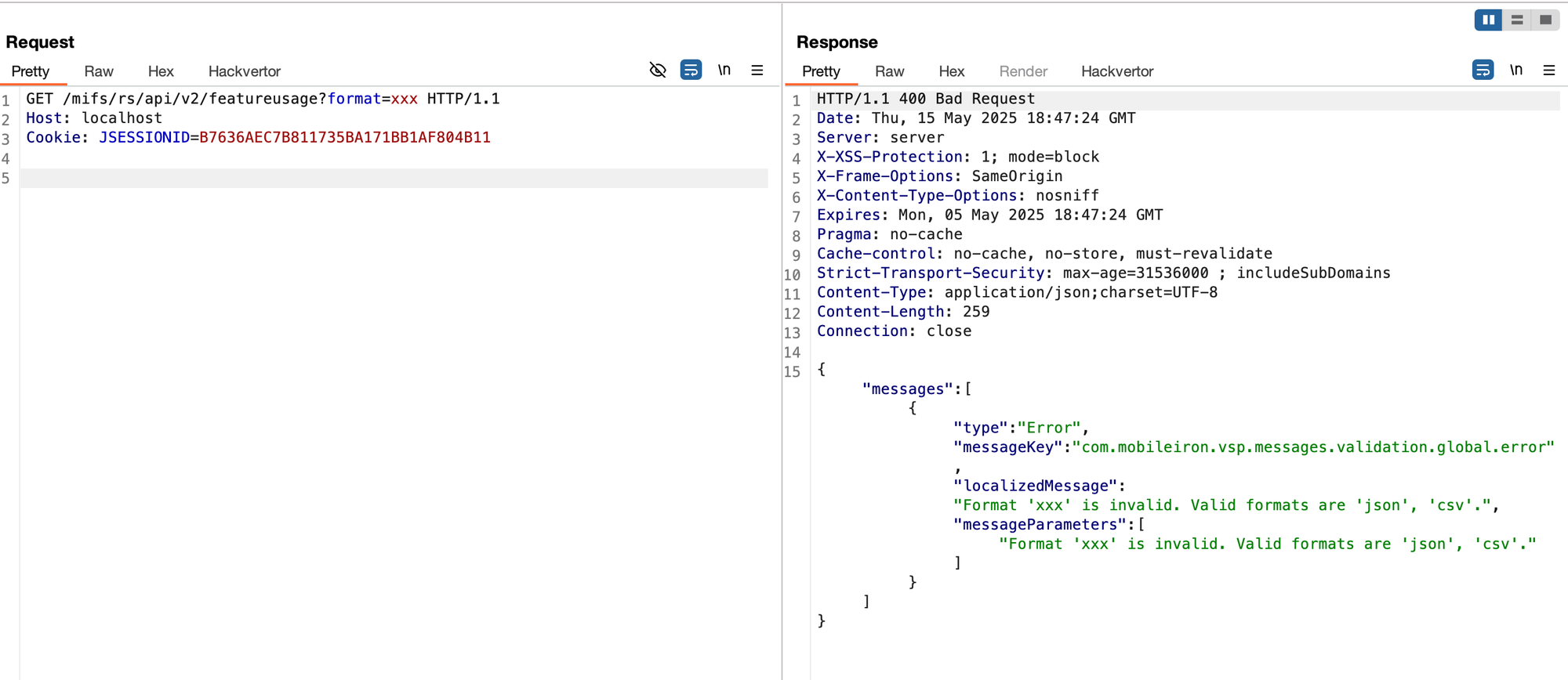 and as expected we got the response "Format 'xxx' is invalid. Valid formats are 'json', 'csv'."